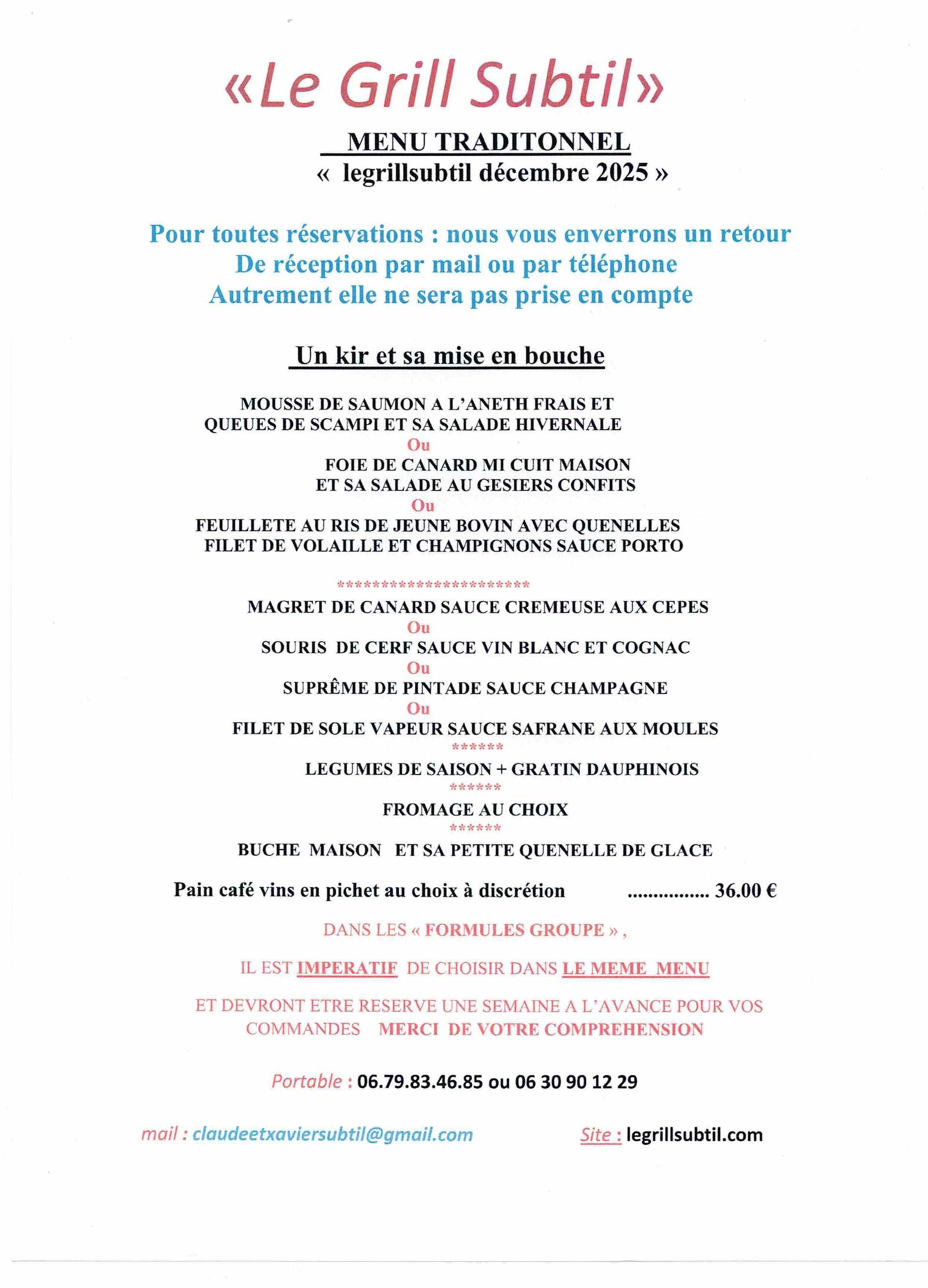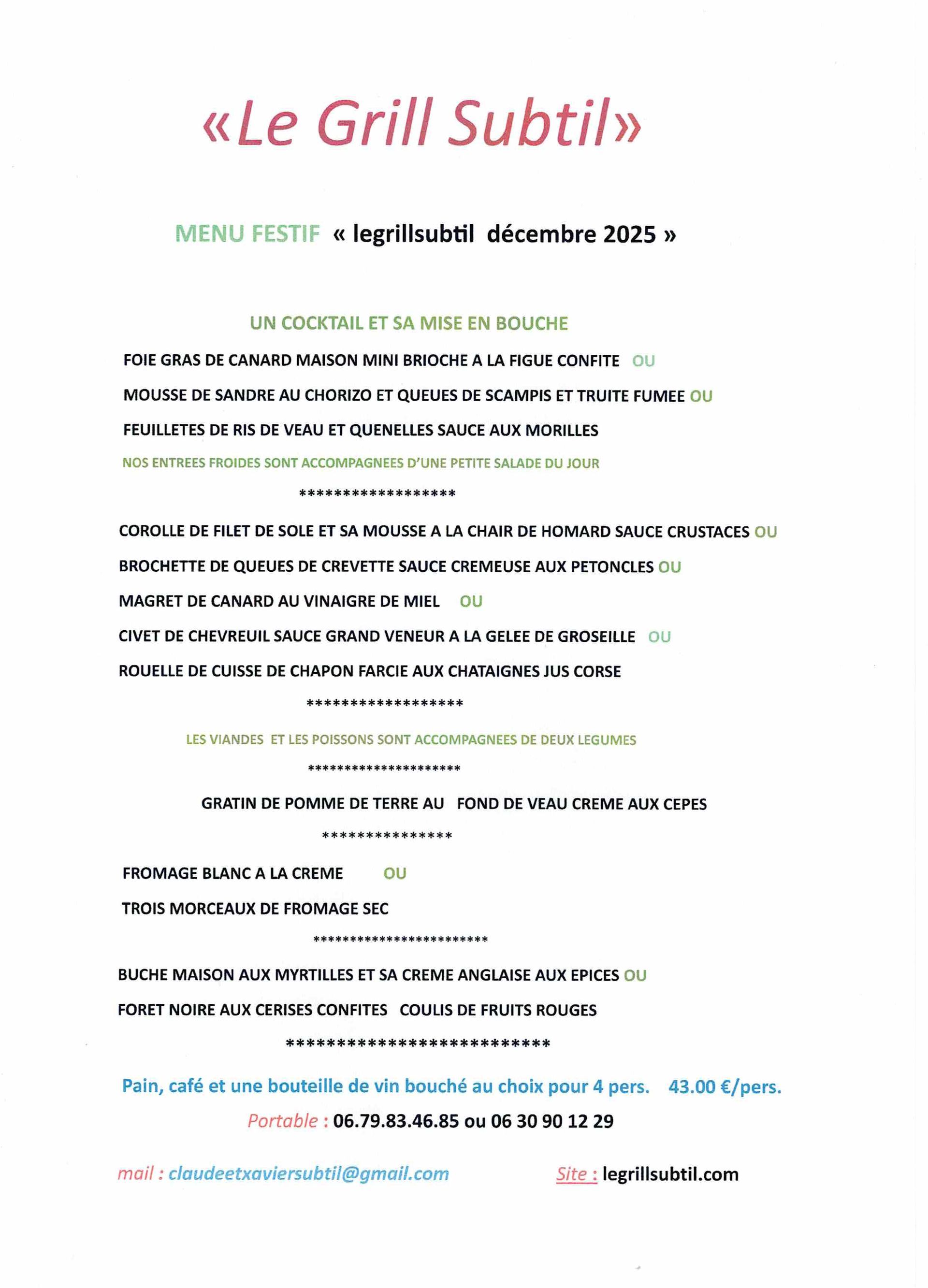 nous vous proposons deux menus pour le mois de décembre et périodes de fêtes pour toute réservations